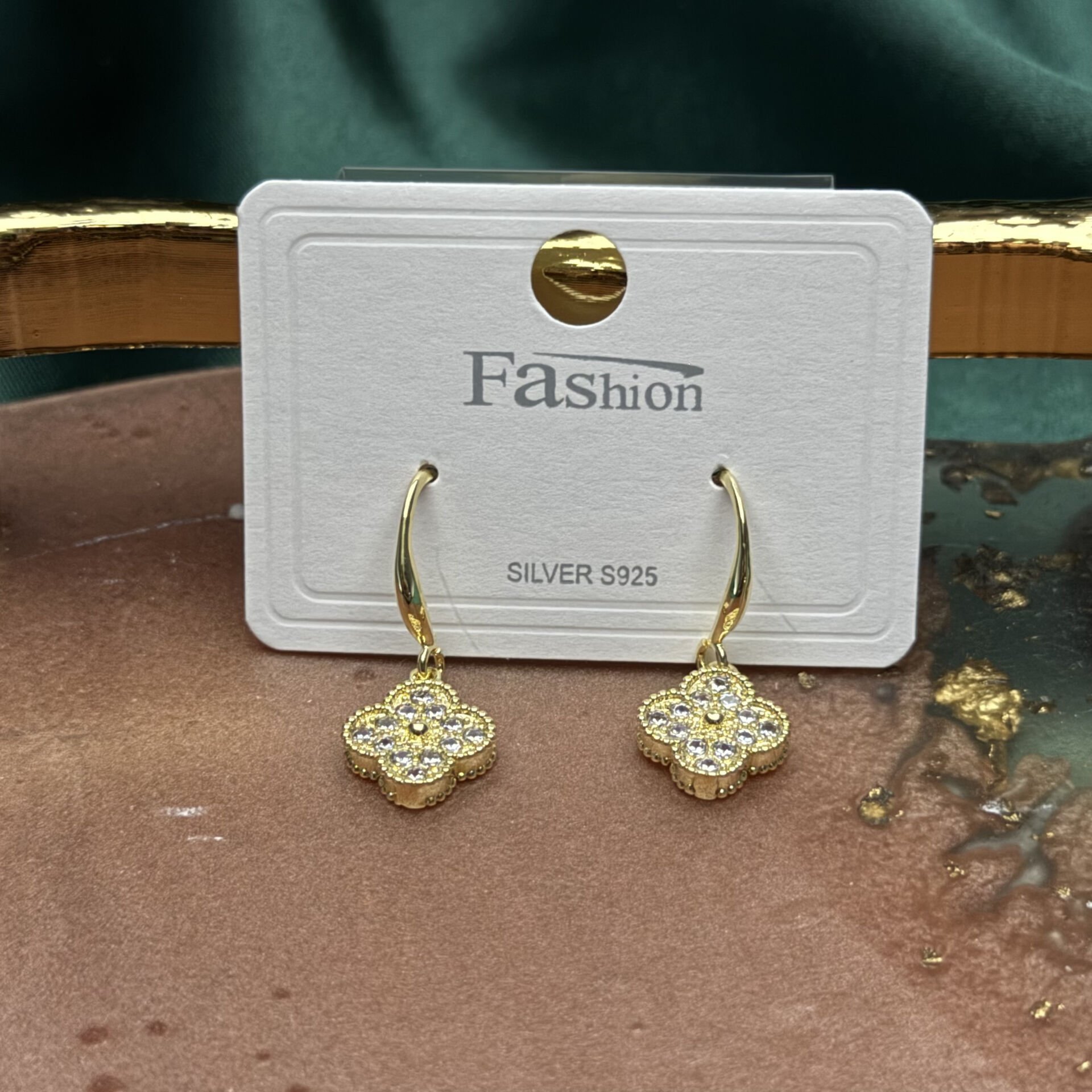 Zarif çiçek motifli tasarımı ve ince taş detaylarıyla öne çıkan bu gold sallantılı küpe, feminen ve sofistike bir stil sunar. Alt kısmında yer alan dört yaprak formundaki motif, zirkon taş dizilimi sayesinde ışığı güçlü şekilde yansıtarak göz alıcı bir ışıltı oluşturur. Üst bölümdeki sade gold halka detayı ise tasarıma modern bir denge kazandırır.