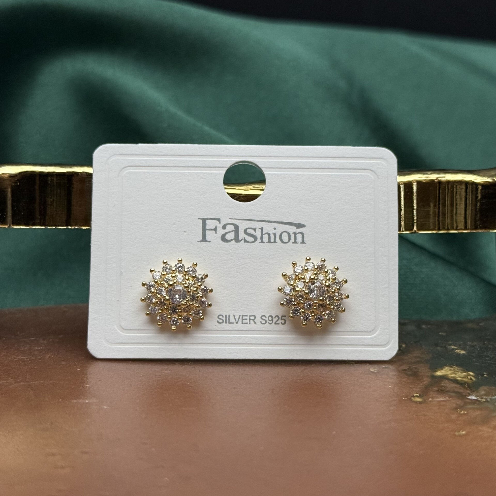 Merkezde yer alan parlak taş detayı ve etrafını saran çoklu minik taş dizilimiyle tasarlanan bu gold küpe modeli, güneş formundan ilham alan ışıltılı bir görünüm sunar.