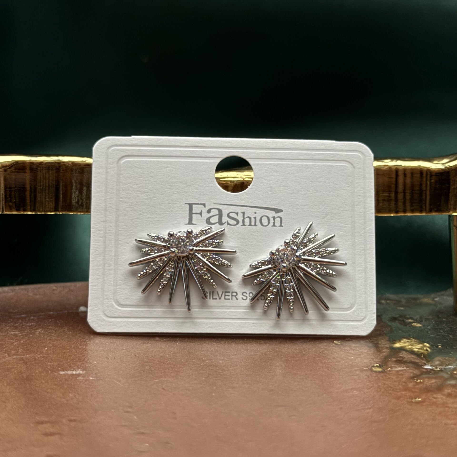 Güneş ışınlarından ilham alan modern formu ve merkezde yer alan zirkon taş detayıyla tasarlanan bu silver küpe, güçlü ve ışıltılı bir stil sunar. Çok yönlü ışın tasarımı kulakta dikkat çekici bir etki oluştururken, ortadaki taş detayı modele zarif bir odak noktası kazandırır.
