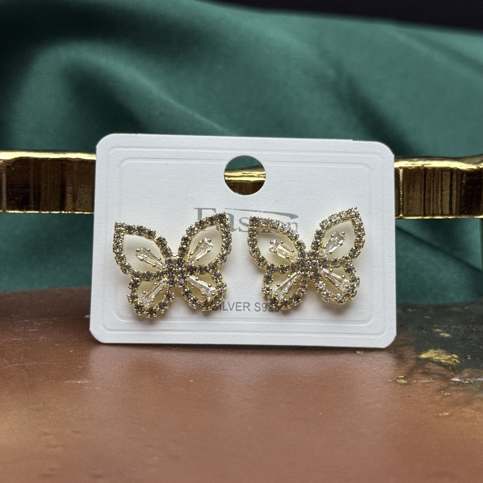 Zarif kelebek formu ve yoğun taş detaylarıyla tasarlanan bu gold küpe modeli, feminen ve ışıltılı bir şıklık sunar. Kanat formundaki tasarım, merkezden dışa doğru yerleştirilen taş kesimleriyle ışığı her açıdan yansıtarak göz alıcı bir etki oluşturur.