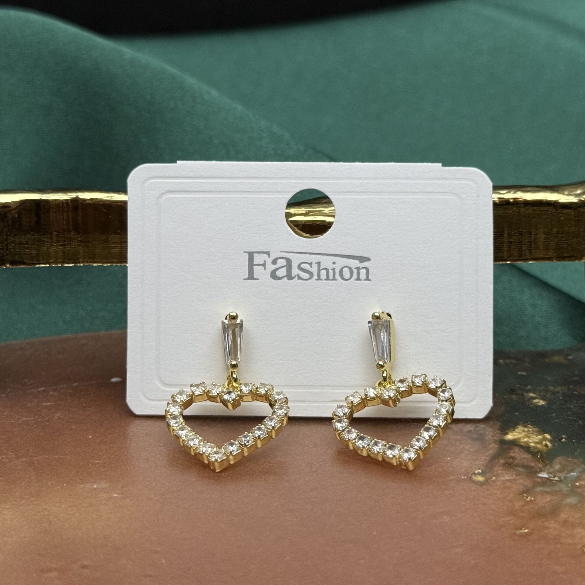 Zarif kalp formu ve çevresini saran ışıltılı taş detaylarıyla tasarlanan bu gold küpe modeli, romantik ve şık bir görünüm sunar.