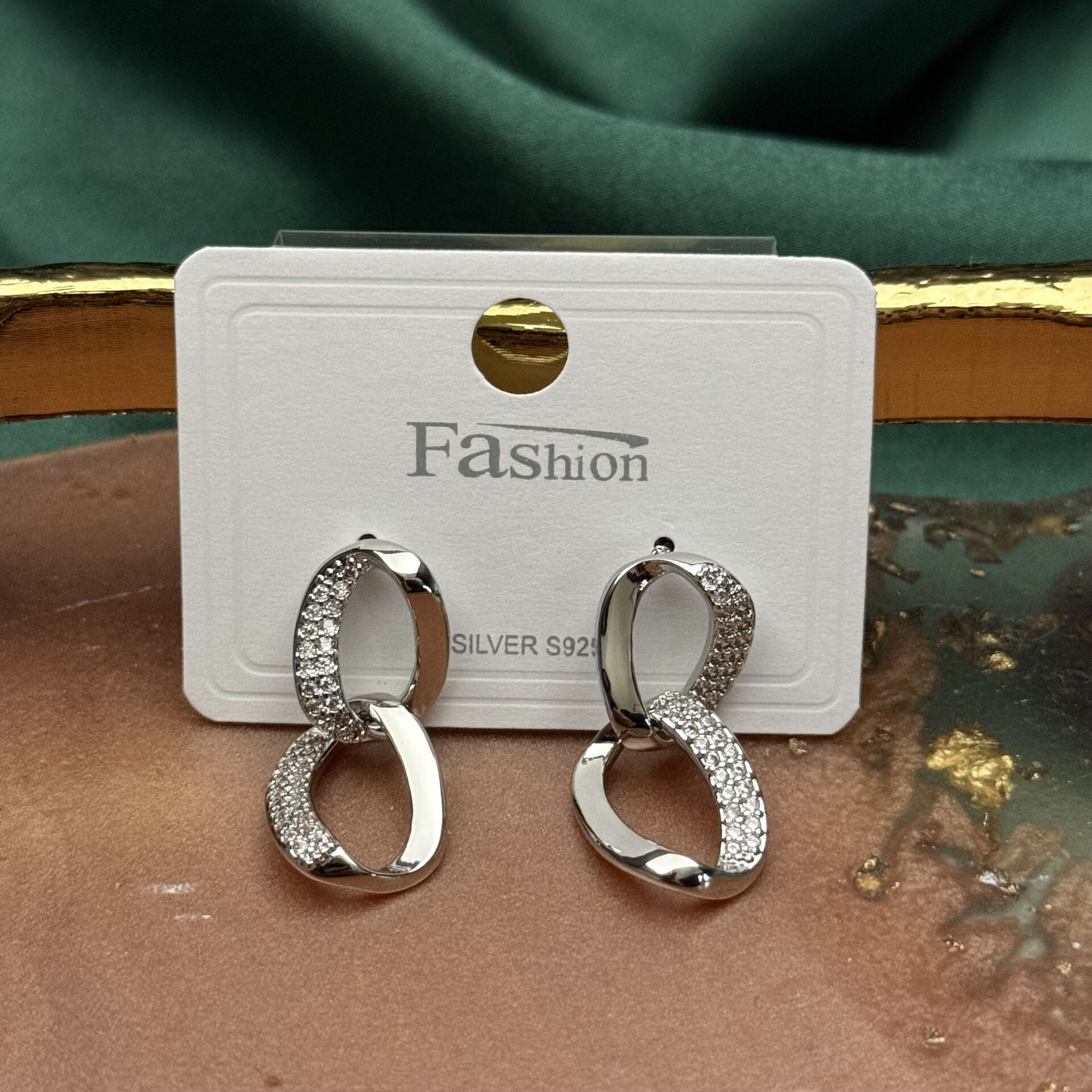 Modern çizgiler ve zarif ışıltının buluştuğu bu zirkon taşlı silver küpe, iç içe geçmiş form tasarımıyla güçlü ve şık bir görünüm sunar. Parlak silver yüzeyi ışığı doğal şekilde yansıtırken, taşlı kısmındaki yoğun zirkon dizilimi her harekette göz alıcı bir ışıltı sağlar.