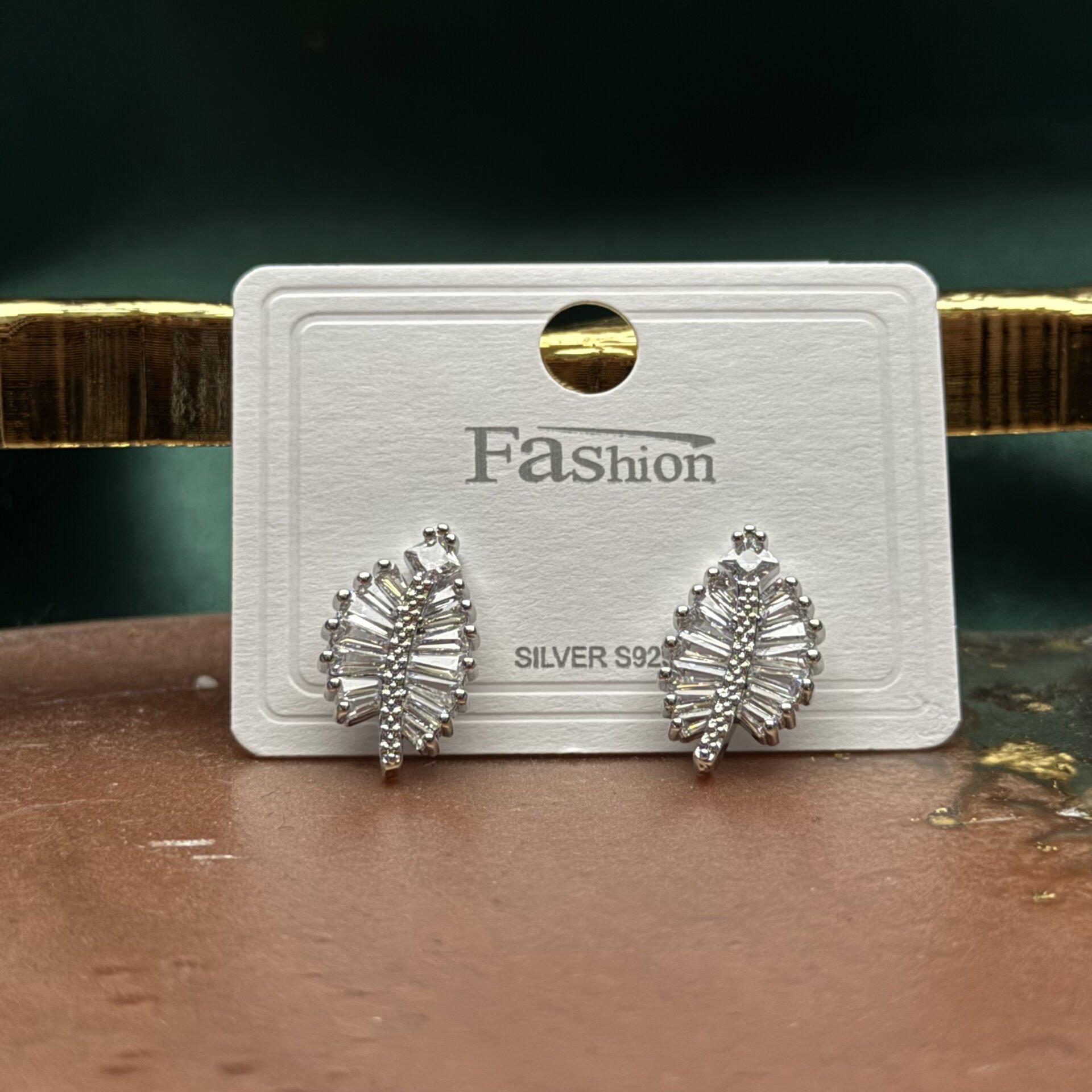 Doğadan ilham alan zarif yaprak formu ve baget kesim zirkon taş dizilimiyle öne çıkan bu silver küpe, modern ve sofistike bir görünüm sunar. Taşların yaprak şeklinde simetrik yerleşimi ışığı farklı açılardan yansıtarak güçlü ama dengeli bir ışıltı oluşturur. Ortadan geçen silver detay tasarıma derinlik ve netlik kazandırır.